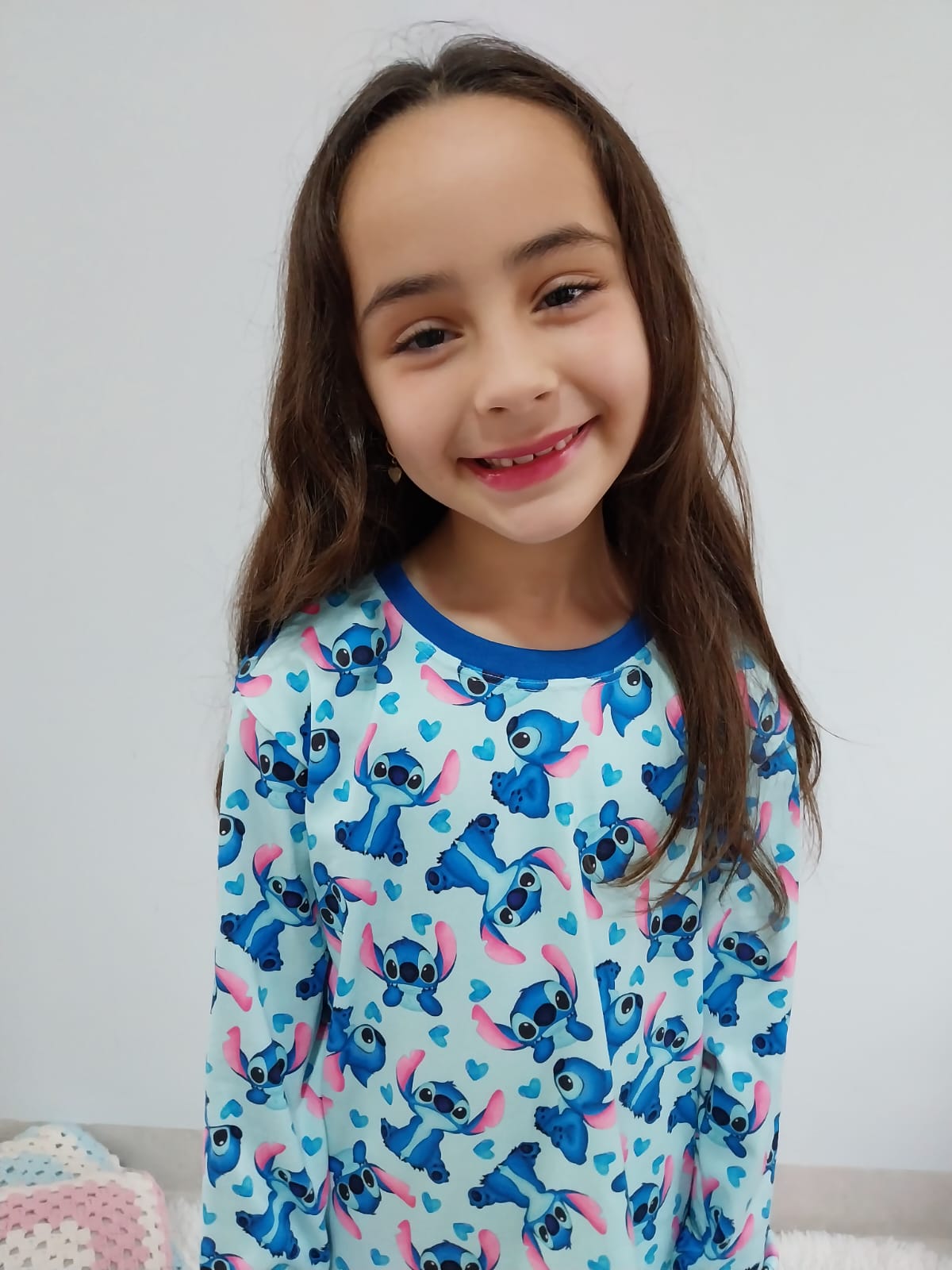 O pijama é composto por uma camiseta manga longa com punho na manga e na gola e uma calça com punho embaixo. A calça possui elástico na cintura.