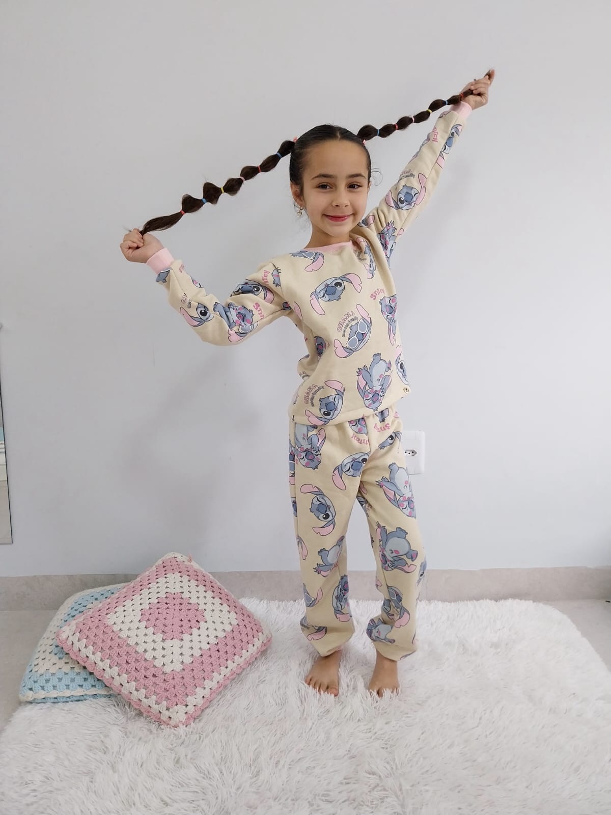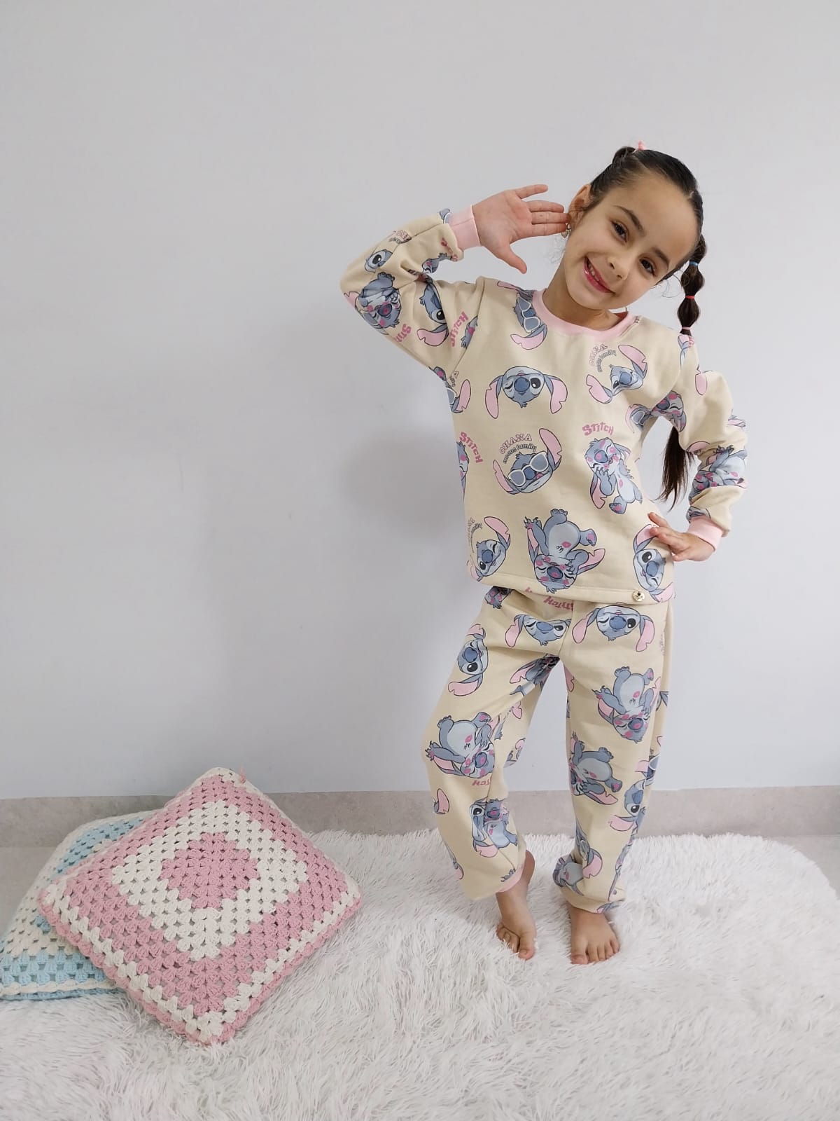 O pijama é composto por uma camiseta manga longa com punho na manga e gola e uma calça com punho embaixo. A calça possui elástico na cintura.