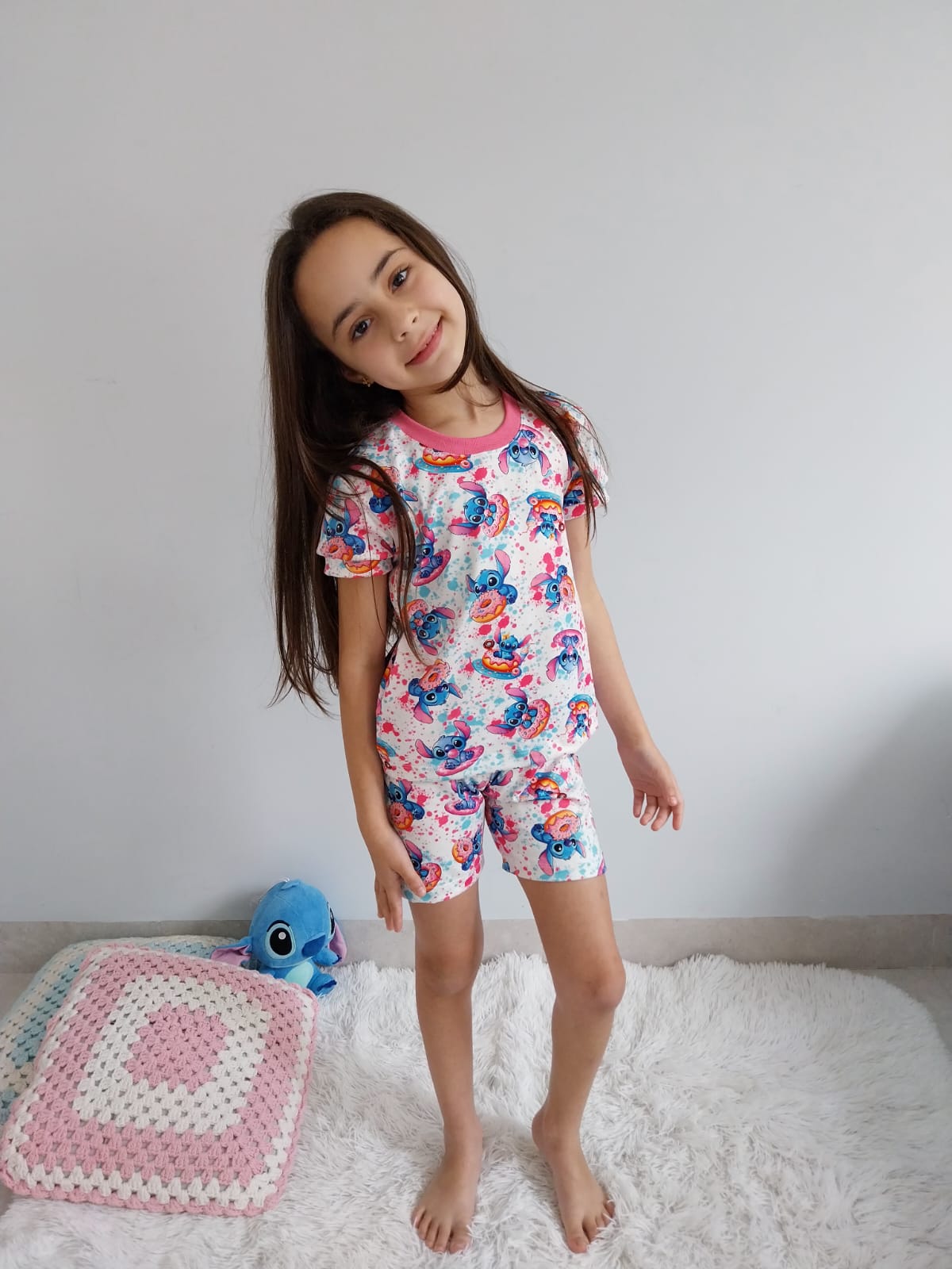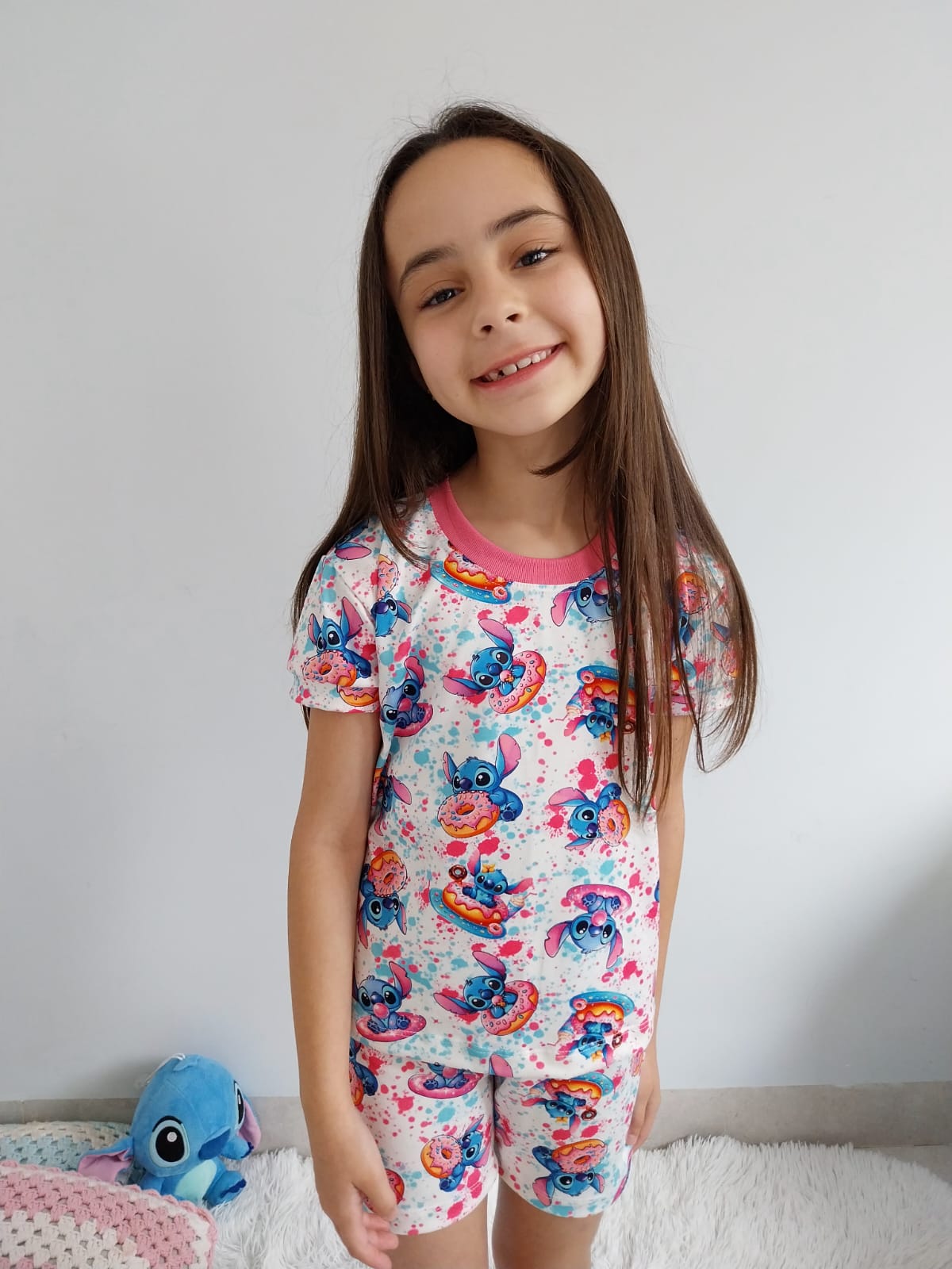 O pijama stitch baby look é composto de uma blusa e um short . o short possui elástico na cintura e a blusa de manguinha curta com punho na gola .