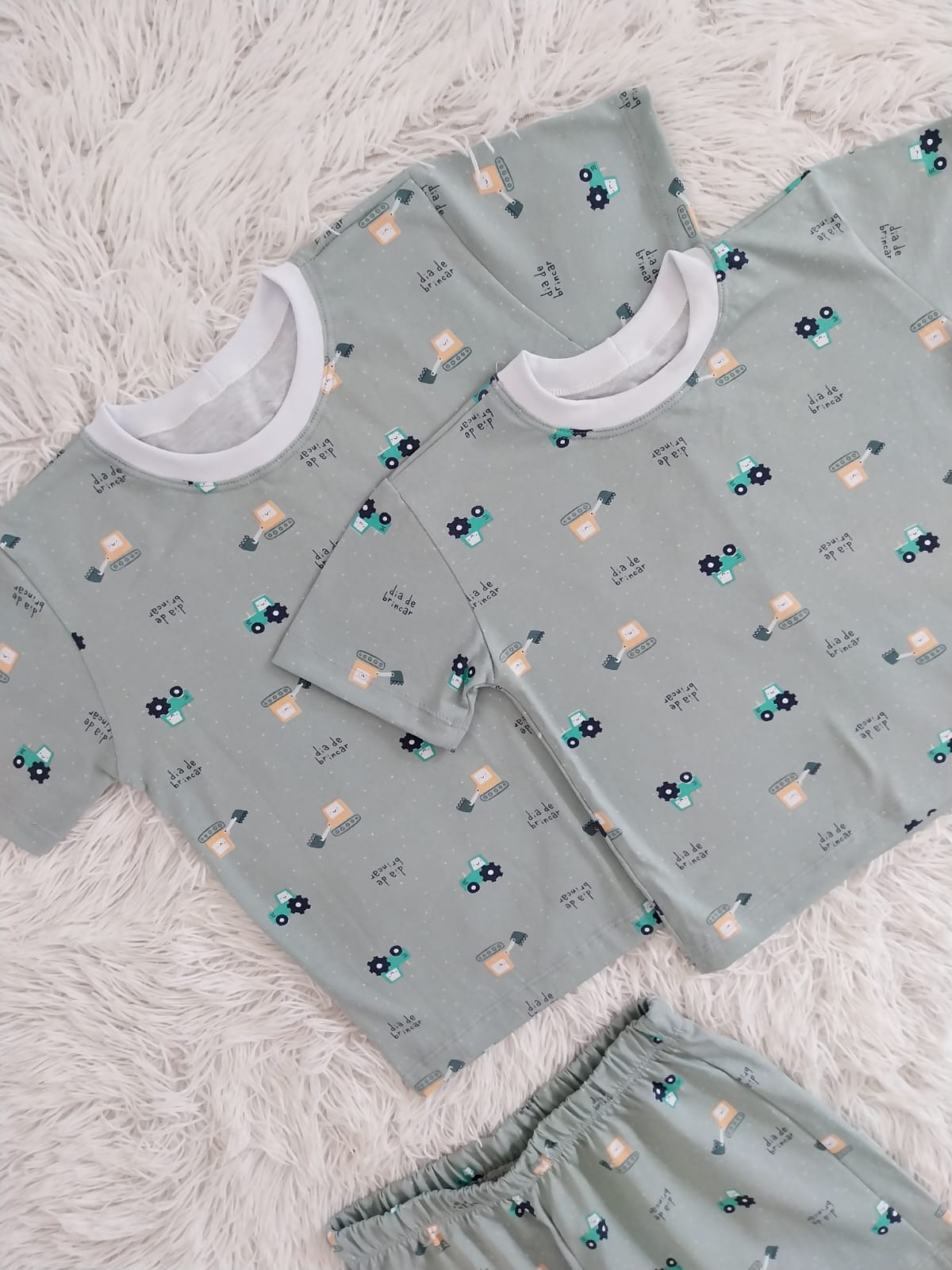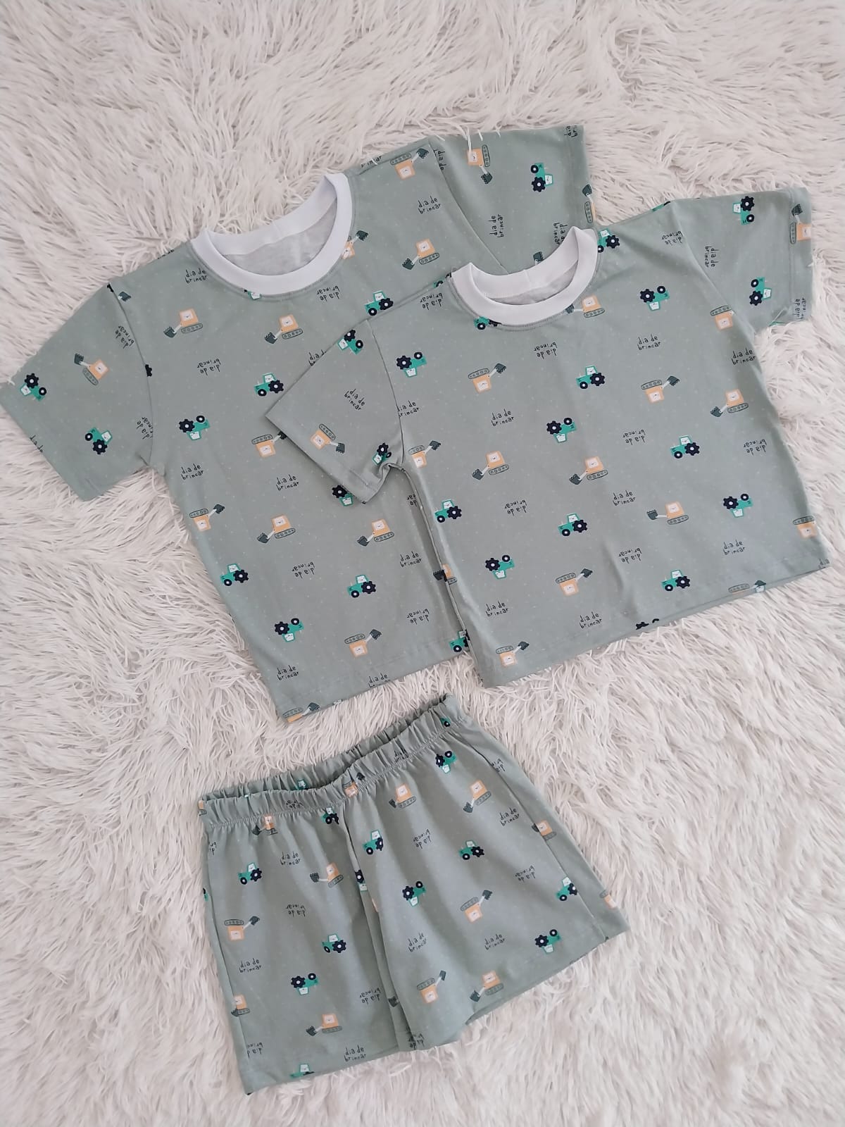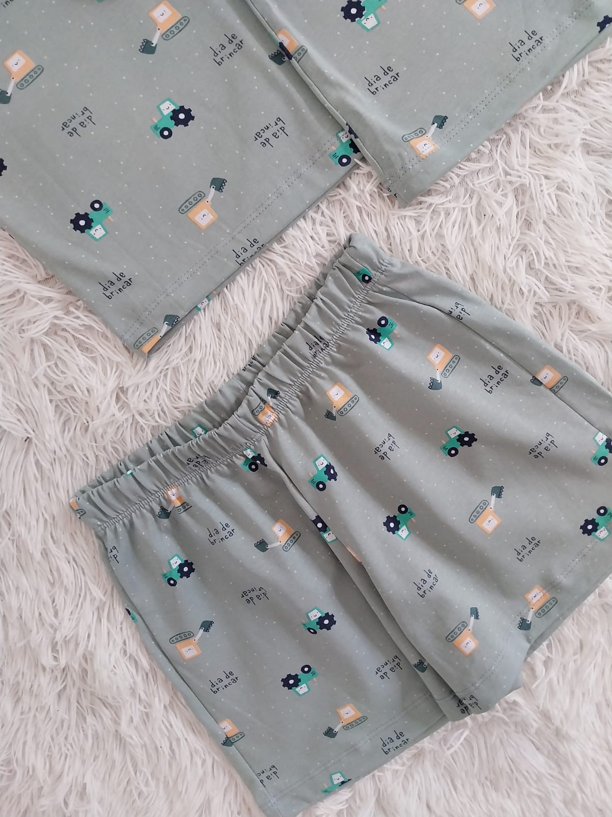 O pijama é composto por uma camiseta e um short . o short possui elástico na cintura.