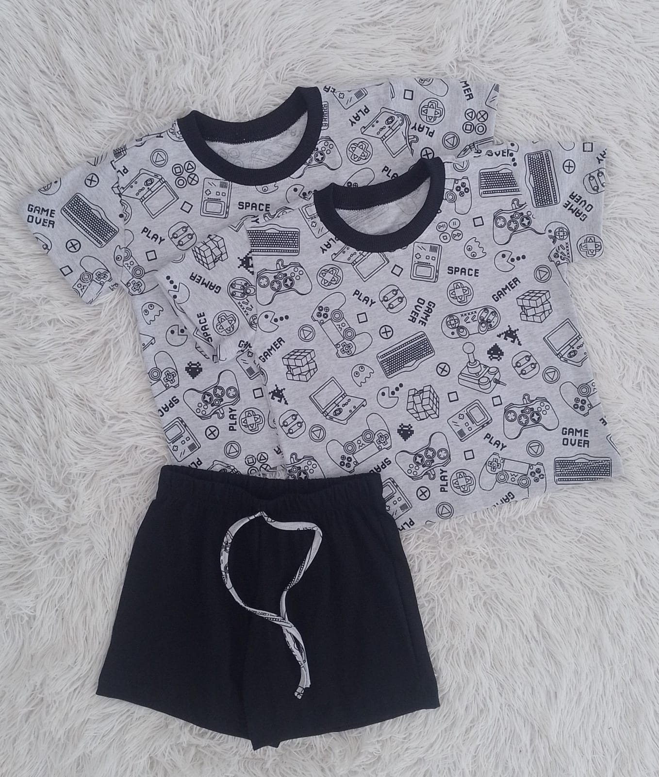 O pijama é composto por uma camiseta e um short . o short possui elástico na cintura.